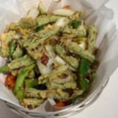 Mild spicy. Lightly breaded string beans, fresh chili, onions, scallions, sweet n' sour dip.