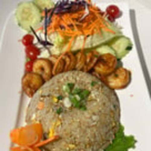 Grilled shrimp, fried rice, house salad.