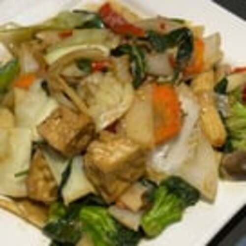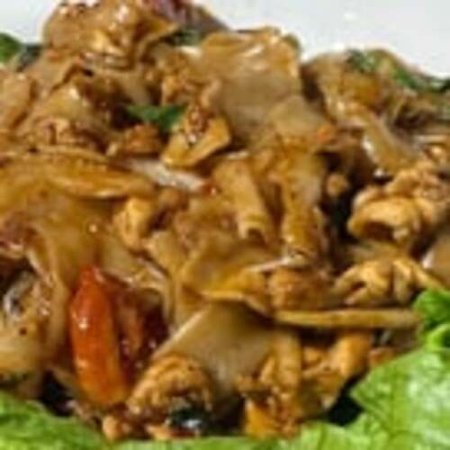 Medium spicy. Fresh hand cut wide rice noodles, chili, onions, tomatoes, bell peppers, basil leaves.