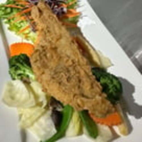 Crispy flounder with a sauce of your choice: chili basil sauce or ginger sauce.