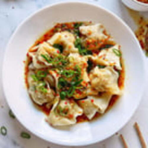Mild spicy. Shrimp and chicken wantons, silk chili paste sauce.