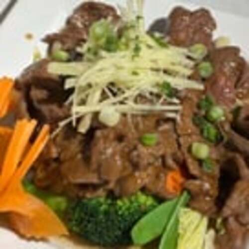 Asian style marinated NY steak, steamed broccoli. With your choice of Jasmin rice or fries.