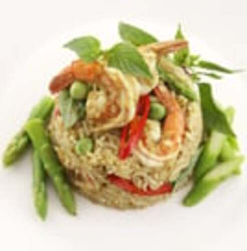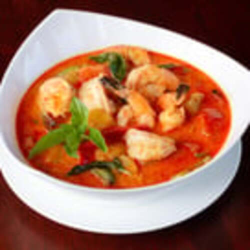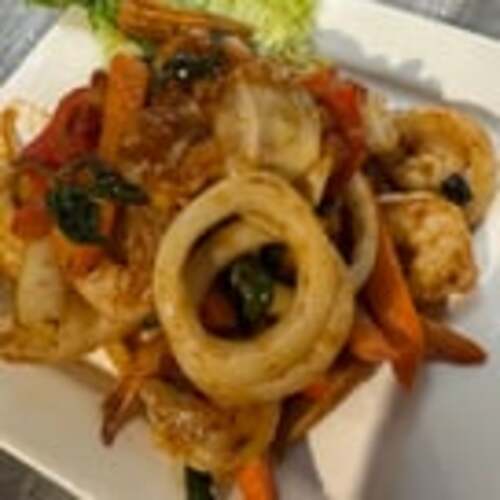 Mild spicy. Shrimp, squid, vegetables, basil leaves, sweet spicy chili mixture.