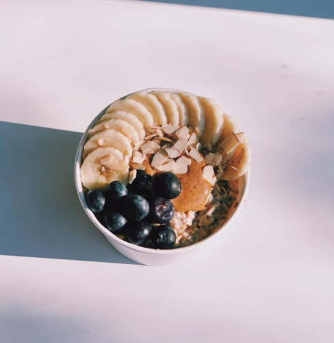 BASE: Rolled Oats, Almond Milk, Chia Seeds, Cinnamon, Maple Syrup, Vanilla Bean, TOP: Fresh Blueberries, Almond Slivers, Coconut Flakes (Gluten Free - Contains Nuts)