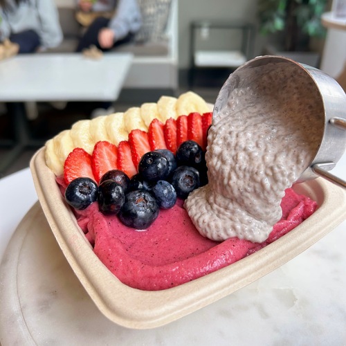 ON TOP: Granola, Banana, Strawberry, Hemp Seeds, Almond Butter Drizzle BLEND: Organic Açai, Banana, Blueberries, Almond Milk