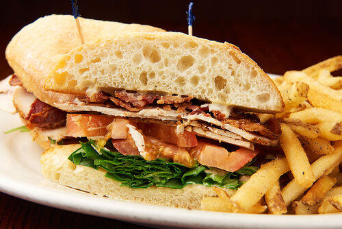 Thin-sliced chicken, smoked bacon, romaine lettuce, tomato, roasted garlic aioli on toasted ciabatta - side fries
