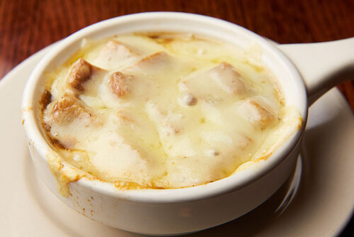 Cup/Bowl. Caramelized onions, pale ale beef broth, garlic croutons, Swiss Cheese