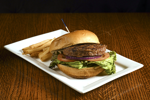 With red leaf lettuce, sliced tomato, red onion on a brioche bun - side fries. Burger extras
