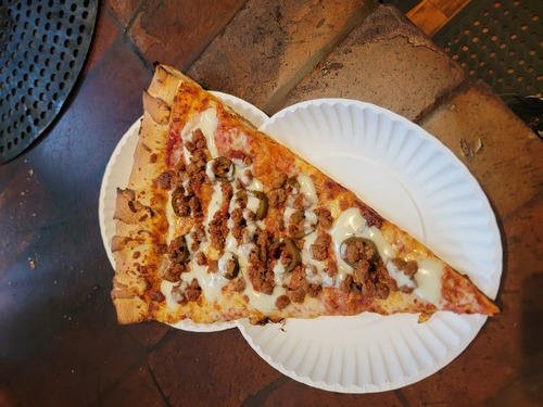 Taco seasoned beef with jalapeƱos and a queso blanco drizzle