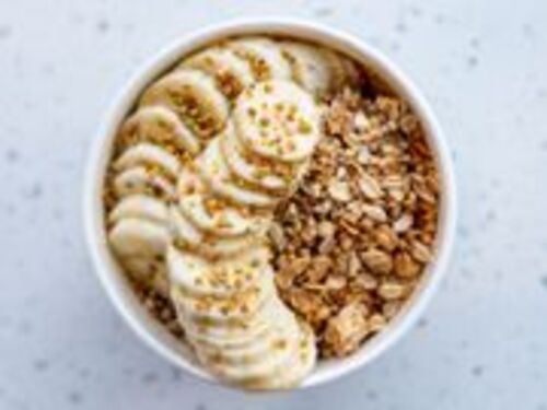 House Base topped with banana, granola, bee pollen, and agave.