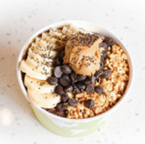 House Base topped with banana, granola, peanut butter, chocolate chips, and chia seeds.