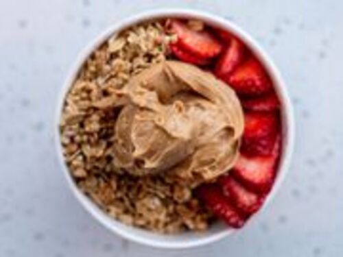House Base topped with strawberry, banana, and peanut butter.