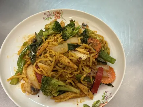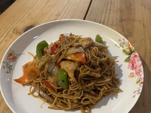 Lomein noodle, bell pepper, white onion, carrot and basil in chili paste sauce.