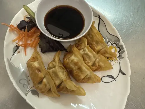 Chicken and vegetable dumplings, deep fried with sweet ginger soy sauce.