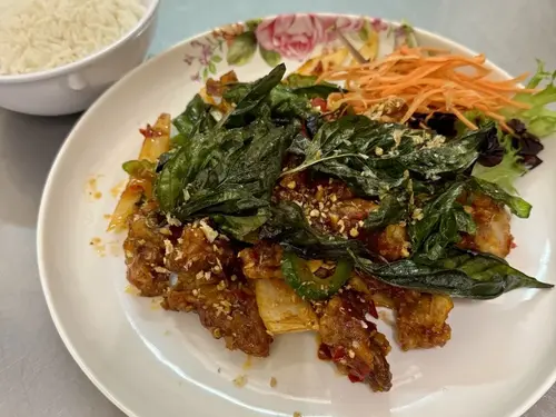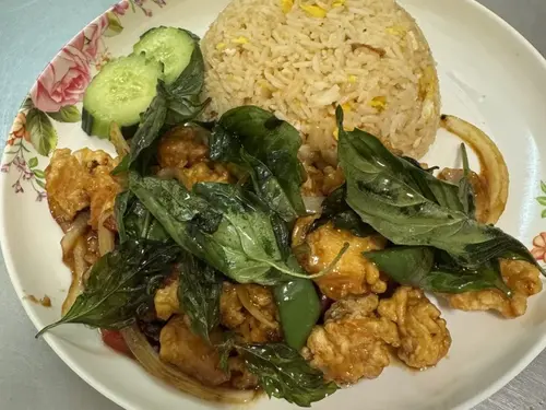 Egg fried rice side of crispy chicken with spicy basil sauce topped with crispy basil leaves.