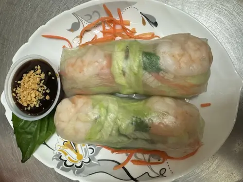 Lettuce, carrot, rice noodle, cucumber, and basil wrapped in rice paper. Served with hoisin peanut sauce.