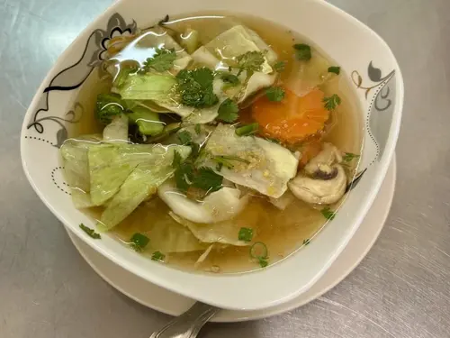 Chicken wontons in chicken broth with napa cabbage.