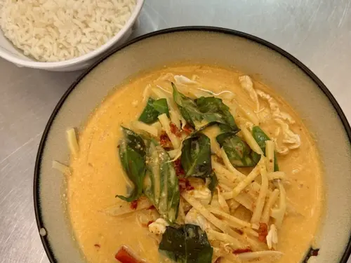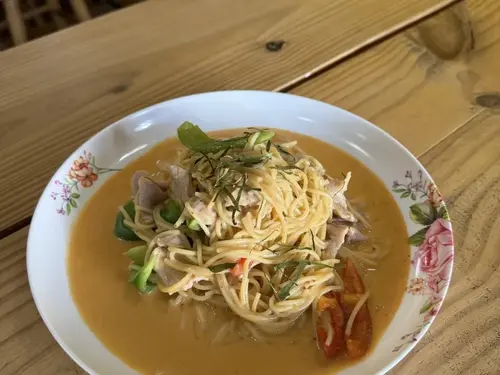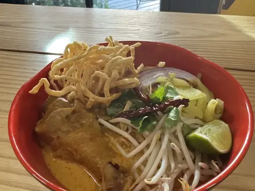 Egg noodles with chicken in northern Thai curry sauce.