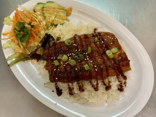 Unagi (eel) served with rice, eel sauce and sesame. Side of wasabi, pickled ginger, carrot, cucumber, lettuce topped with yum yam sauce.