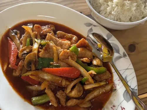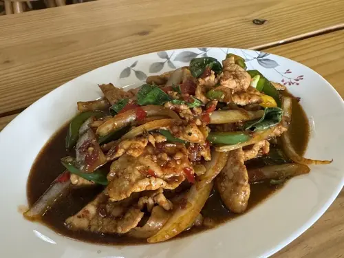 Bell pepper, white onion, mushroom and scallion in homemade chili paste sauce.