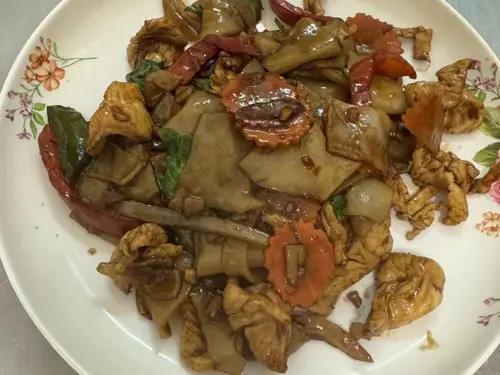 Flat noodle, bell pepper, white onion, carrot and basil in brown sauce.