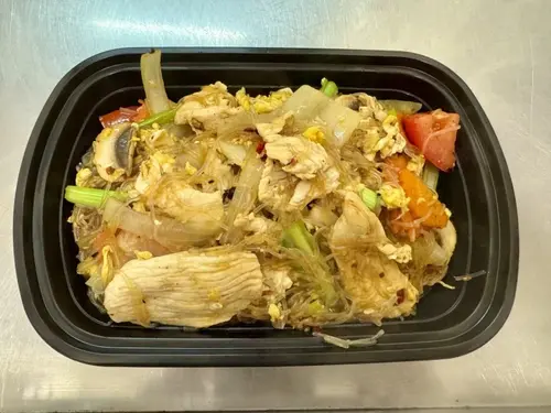 Glass noodle, egg, carrot, baby corn, white onion, mushroom and scallion in brown sauce.