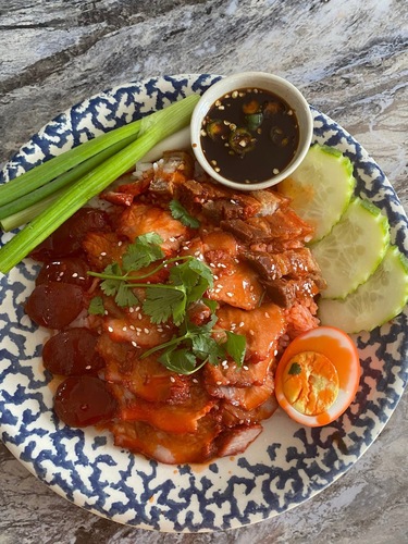 Red barbecued pork and crispy pork belly with rice, a hard-boiled egg and sweet Chinese sausage served with Thai sweet red barbecue sauce.
