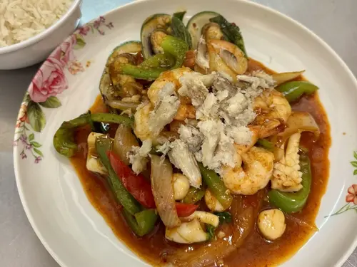 Bell pepper, white onion, green bean and basil in basil chili sauce topped with crispy basil.