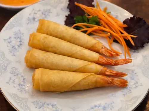Deep-fried shrimp wrapped in spring roll paper.