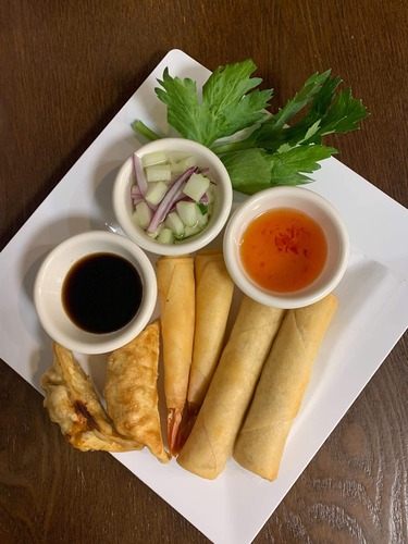 2 fried spring rolls, 2 gyozas, 2 sexy shrimp.
