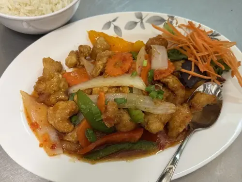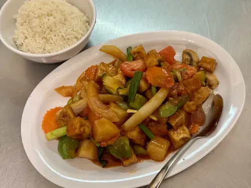 Crispy chicken or shrimp, bell pepper, white onion, carrot and scallion in homemade sweet sauce.