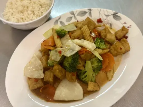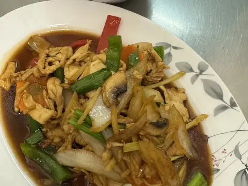 Bell pepper, white onion, mushroom, green bean, carrot and ginger in brown sauce.