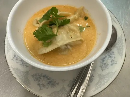 Steamed gyoza in red curry sauce.