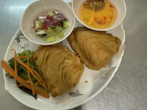 Chicken, potato, onion, curry powder wrapped in wonton skin.