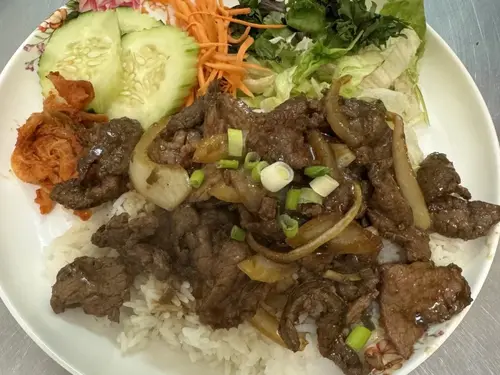 Rib eye beef marinated and aged with homemade sauce stir-fried with white onion topped with scallion and sesame. Side of lettuce, cucumber, carrot and kimchi.