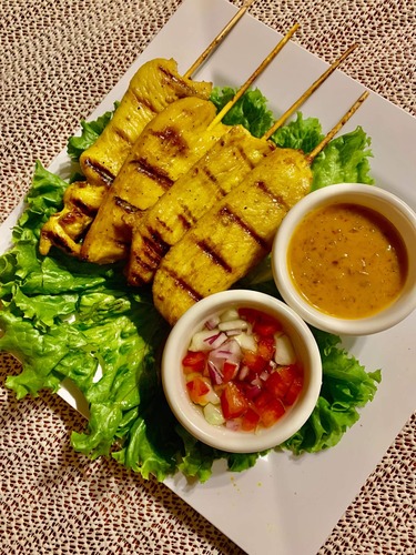 Grilled skewers served with peanut sauce and sweet vinegar sauce.