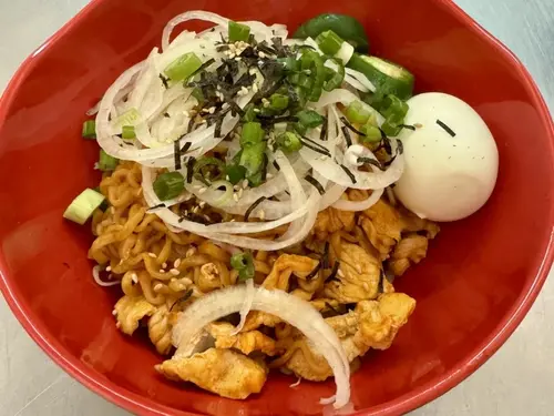 Korean ramen noodle, bean sprout, boil egg, jalapeno, scallion and cilantro in hot sauce.