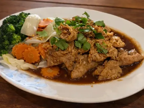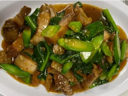 Crispy pork belly, garlic, chili and Chinese broccoli in brown sauce.