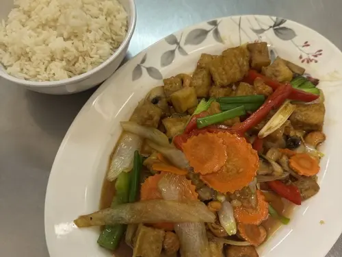 Bell pepper, white onion, mushroom, cashew nut, scallion, basil and chili paste.