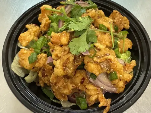 Crispy chicken, chili, rice powder, red onion, scallion and cilantro in lime juice.