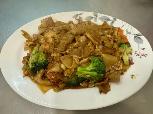 Flat noodle, egg, broccoli and carrot in brown sauce.