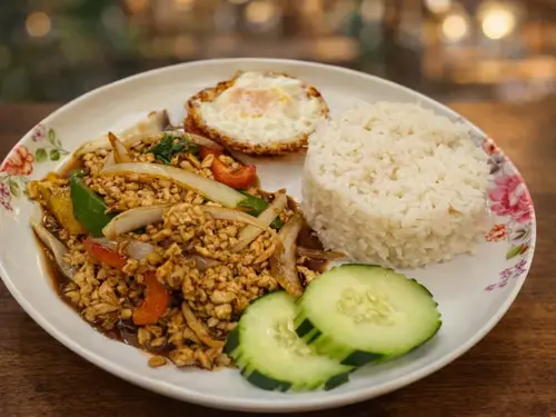 Stir-fried basil with bell pepper, white onion and basil served with rice and fried egg.