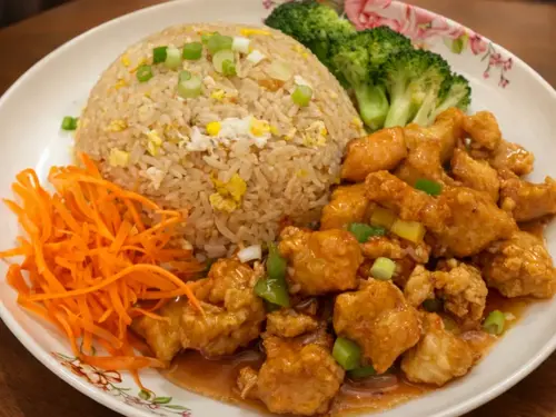 Egg fried rice side of crispy chicken, bell pepper with sweet and sour sauce topped with scallion.