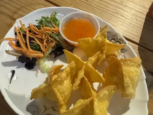 Served with sweet and sour sauce topped with peanuts.