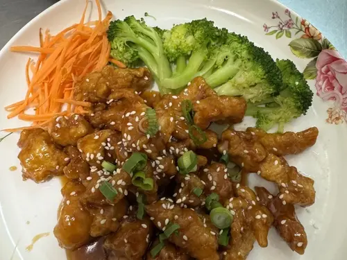 Crispy chicken, broccoli in sesame sauce topped with sesame.