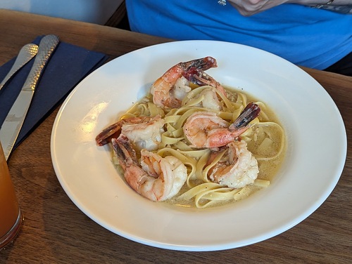 jumbo shrimp served in a white wine butter sauce over fettuccine