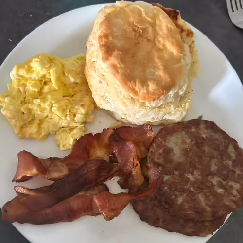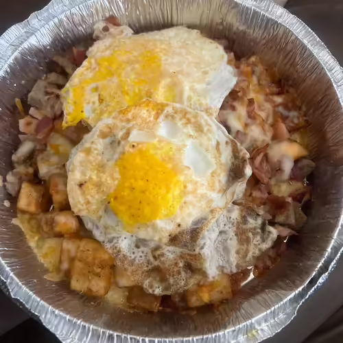 Pork sausage, bacon and ham over grits or potatoes topped w/ melted cheddar