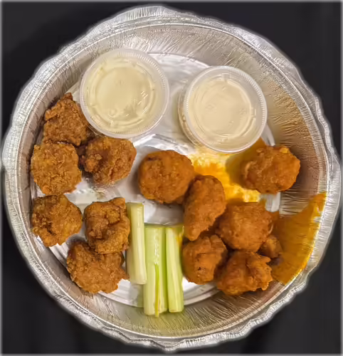 12 Vegan "Chicken" Wings Breaded and fried and tossed in your choice of sauce and choice of dressing