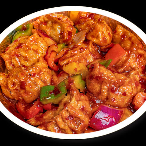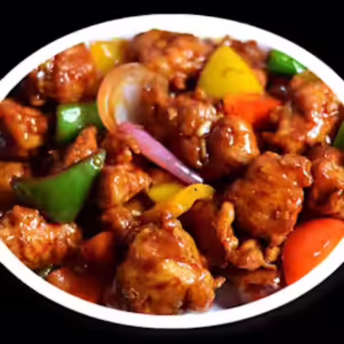 Tender marinated chicken pieces stir-fried with bell peppers, and onions in a flavorful, spicy sauce.