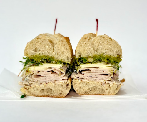 Baguette, Smoked Turkey, Avocado, Provolone Cheese, Sprouts, Creamy Whole Grain Mustard